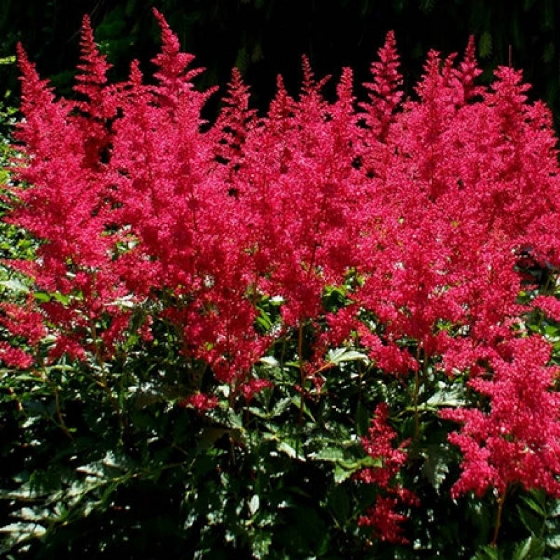 Рассада астильбы Арендса Бургунди Рэд (Burgundy Red) легко приживается и становится особенно эффектной во время цветения в массовых посадках. На зеленой листве пламенеют яркие ветвистые соцветия, усеянные множеством мелких красных звездочек. Не менее интересно наблюдать за появлением первых побегов, которые прорастают темно-красными, и затем раскрываются и зеленеют.