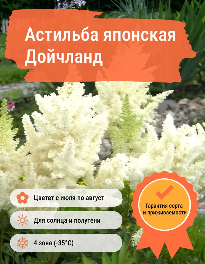 Рассада астильбы японской Дойчланд (Deutschland) относится к раннецветущим сортам группы и уже в первых числах июля порадует вас белоснежными пышными соцветиями. Кстати, японцы называли астильбу «Авамори-со», что означает – «Пенный цветок». Сорт Deutschland как никакой отражает это название. Кремово-белая пена цветов будет радовать глаз почти месяц – это один из самых долгоцветущих сортов. Семена и рассада неприхотливы, но не выдерживают засушенной почвы и воздуха. Поэтому надо следить за поливом, особенно в жаркие летние дни. Лучше всего растут по берегам водоёмов на слегка затенённых участках.