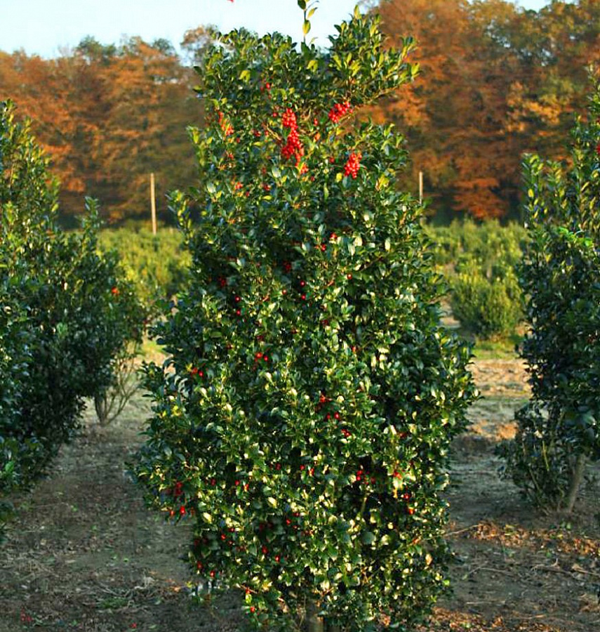 Саженцы Падуба Мезерва Хекенпрахт (Heckenpracht) – интересный и красивый вид падуба. Веточки саженцев расположены вертикально и в будущем вырастут до двух метром в высоту. Кустарник каждый год становится больше на 15-25 сантиметров. Упругие веточки обильно покрыты листвой глубокого зелёного цвета. Каждый листок по краям украшен ярко выраженными зубчиками, они выглядят прочными, но совсем не колются. Располагать падуб стоит на плодородной земле, умеренной влажности. Этот сорт хорошо соседствует с другими растениями. Зимой нет необходимости укрывать кустарник. Всю зиму на ветках будут висеть красные ягодки бусины. Они эффектно смотрятся среди тёмных, кожистых листьев.