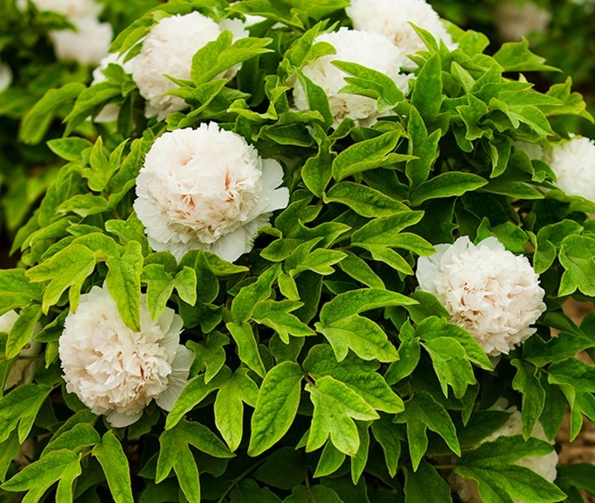 Саженцы пиона древовидного Xue ta (Jing Yu) Привлекает людей своим белым и безупречным внешним видом. Это очень нежный и элегантный пион. Цветки вначале зелено-белые, а в полном цветении становятся белоснежными, в форме короны иногда в форме лотоса, приплюснутые, с розовым румянцем у основания; внутренние лепестки плотно симметричны, с небольшим количеством тычинок, смешанных между лепестками, Цветение сопровождающимся восхитительным сладким ароматом. Многолетний кустарник в зрелом возрасте представляет собой захватывающее зрелище, заслуживающее особого расположения в саду. Длинные стебли с темно зелеными, тонкими листьями и крепкими ветвями. Древовидный пион открывает всю свою красоту, распуская пышные бутоны. Их лепестки удивляют нежностью и тонкостью, а также привлекают взгляд необычной окраской. Древовидные пионы обладает не сильным, но приятным и нежным ароматом. В отличие от травянистого пиона стебли такого растения в осеннее время не увядают, а с каждым годом разрастаются все больше, и со временем кустик приобретает полушаровидную форму. Характерные особенности растения: